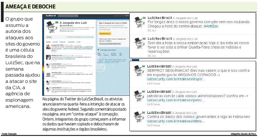 A onda de ataques virtuais começou anteontem, quando um grupo de hackers intitulado LulzSecBrazil elegeu o governo brasileiro como alvo e tirou do ar os sites da Presidência, da Receita Federal e do Portal Brasil.