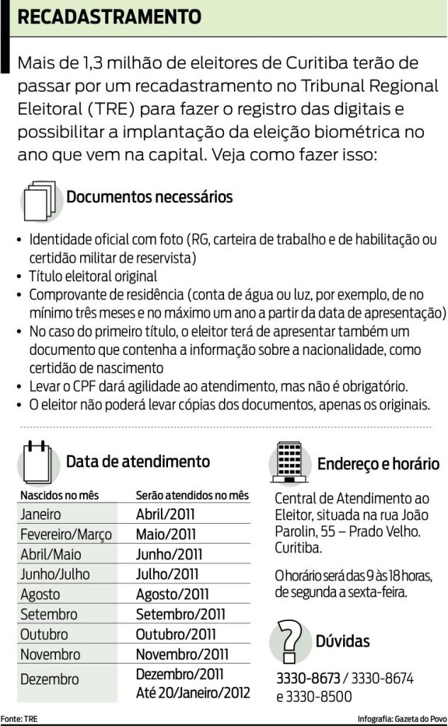 O recadastramento atende a uma medida determinada pelo Tribunal Superior Eleitoral (TSE) para incluir Curitiba entre as cidades que terão eleição em 2012 através da urna biométrica. Mesmo as 54 mil pessoas que já fizeram o cadastro digital em 2010 devem retornar à Central do Eleitor até janeiro de 2012.