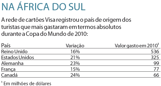 Em termos absolutos, turistas do Reino Unido e Estados Unidos foram os destaques nos gastos com cartão de crédito Visa durante o ano da Copa na África do Sul. Esses países já mantinham um fluxo alto de turistas em 2009, os valores despendidos foram de US$ 461 milhões e US$ 269 milhões, respectivamente, e subiram 16% e 21% em 2010.
