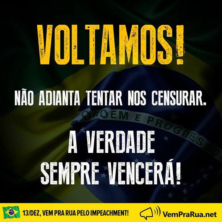 “Depois de 4 horas fora do ar, sem nenhuma explicação razoável para isso, a página do Vem Pra Rua está de volta! Isso se chama censura. Mas não intimidará o movimento! Vem Pra Rua Brasil! Amanhã, domingo, dia 13, todos na rua!”.