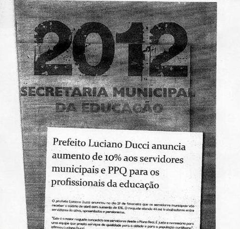 Por meio de uma ação popular, a vereadora Professora Josete (PT) acusa o prefeito de Curitiba, Luciano Ducci (PSB), candidato à reeleição, de fazer promoção pessoal por meio de peças publicitárias da Secretaria Municipal de Educação, distribuídas em creches e escolas municipais.