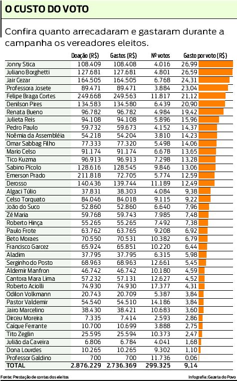 Além dele, sete eleitos gastaram acima de R$ 100 mil: João Cláudio Derosso (PSDB), Sabino Pícolo (DEM), Jair Cezar (PSDB), Denilson Pires (DEM), Juliano Borghetti (PP), Jonny Stica e Caíque Ferrante (PRP).