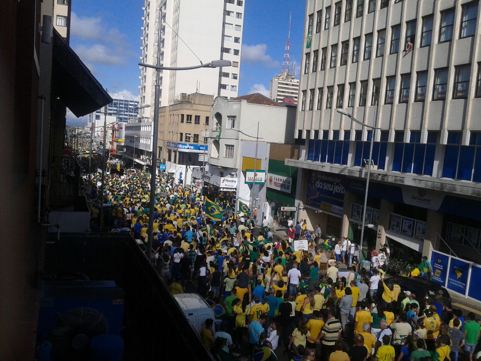 O ato contra a corrupção organizado em Ponta Grossa, nos Campos Gerais do Paraná, reuniu cerca de 20 mil pessoas neste domingo (13), segundo estimativa da Polícia Militar (PM). Os manifestantes se concentraram às 15 horas na praça Barão de Guaraúna, no centro da cidade, e desceram a avenida Vicente Machado até o Complexo Ambiental Governador Manoel Ribas, aos gritos de “Fora Dilma”.