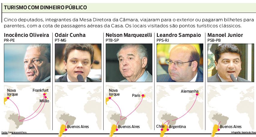De acordo com o Congresso em Foco, as passagens saíram da cota dos deputados Inocêncio Oliveira (PR-PE), segundo secretário; Odair Cunha (PT-MG), terceiro secretário; Nelson Marquezelli (PTB-SP), quarto secretário; Leandro Sampaio (PPS-RJ), terceiro suplente de secretário, e Manoel Junior (PSB-PB), quarto suplente de secretário.