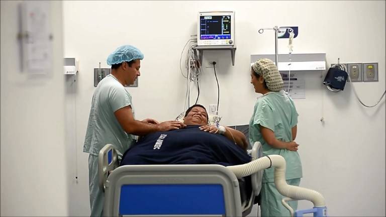 Óscar Vásquez tem 370 quilos e foi levado com a ajuda de 20 pessoas para um hospital de Cali na segunda-feira. Ele precisa passar por vários procedimentos para perder peso