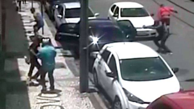 Dois casais aparecem entrando em um carro estacionado na praça. As imagens da câmera de segurança mostram quando um homem armado se aproxima e atira várias vezes. Duas pessoas ficaram feridas, foram mais de 10 disparos.