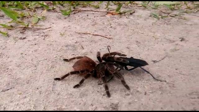 Flagra de leitor na Ilha do Mel mostra vespa arrastando aracnídeo com mais de 10 centímetros de comprimento.
