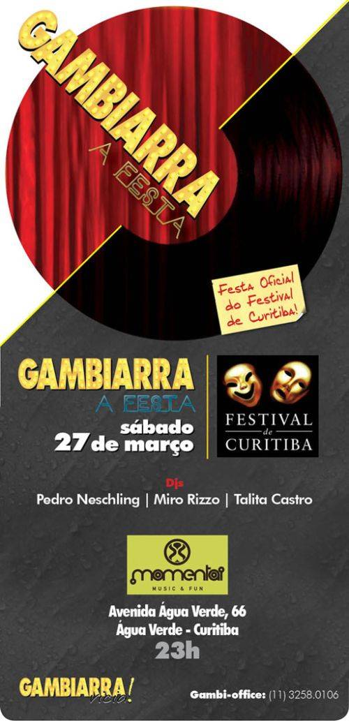 É a festa oficial do Festival de Curitiba, que acontece sábado, dia 27, a partir das 23 horas, na Momentai Music & Fun (Av. Água Verde, 66). Criada em março de 2008 na capital paulista por um grupo de profissionais ligados ao teatro, a Gambiarra tornou-se a balada dos artistas na terra da garoa. Lá ela rola sempre no domingo, que é como se fosse a sexta-feira dos atores, que normalmente trabalham nos fins de semana. Além disso, eles têm 50% de desconto na entrada.