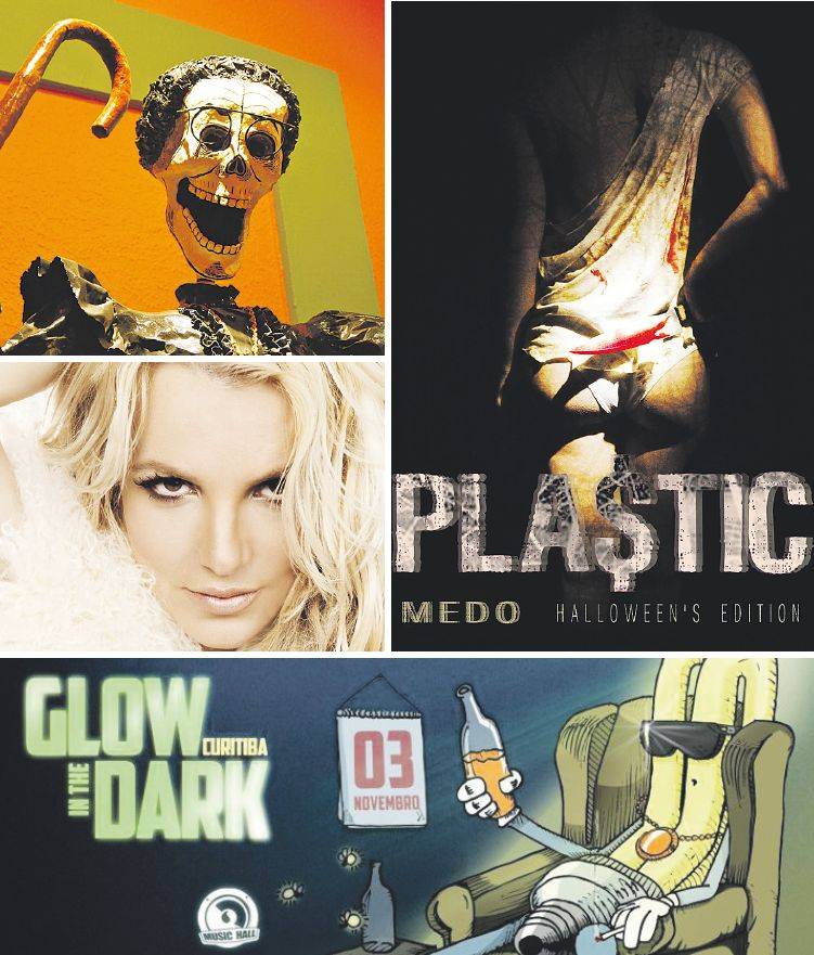 Foto de Gustavo Haas, em exposição no Taco; Cartaz da Pla$tic Medo!, no Wonka; Britney Spears, que será homenageada no Simão; E-flyer da Glow in the Dark