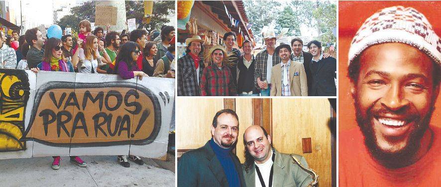 Em sentido horário: A Marcha da Liberdade deste ano em São Paulo. Vamos repetir a dose; Os amigos na Festa Junina dos Amigos do ano passado; Marvin Gaye, que será lembrado hoje no Front Bar; O Duo Sciotti, atração do Jazz Bar.