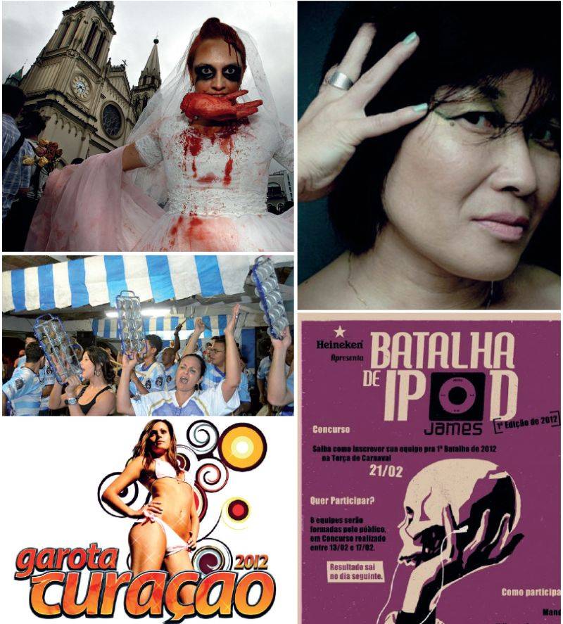 A noiva cadáver Cecilia Miranda foi destaque na Zombie Walk no ano passado. Será que ela aparecerá na Praça Osório neste ano!?; A DJ Sandra Umebala, convidada especial da ROCK2ROCK, no Wonka Bar.; A Bateria da Mocidade Azul anima o Bar Acadêmicos do Salgueiro.; Flyer do concurso Garota Curaçao 2012, em Guaratuba.; Flyer da festa Batalha de iPod, no James Bar
