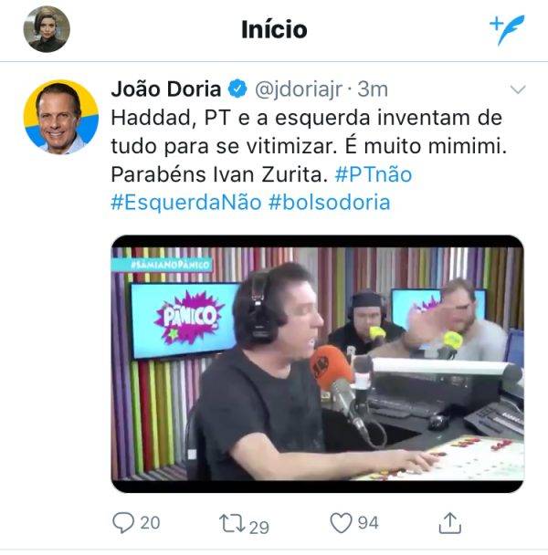 “Haddad, PT e a esquerda inventam tudo para se vitimizar. É muito mimimi. Parabéns Ivan Zurita.”, diz a mitagem (palavra utilizada para descrever uma lacração feita por pessoa de direita) de João Doria, que não repete a fala do apresentador.