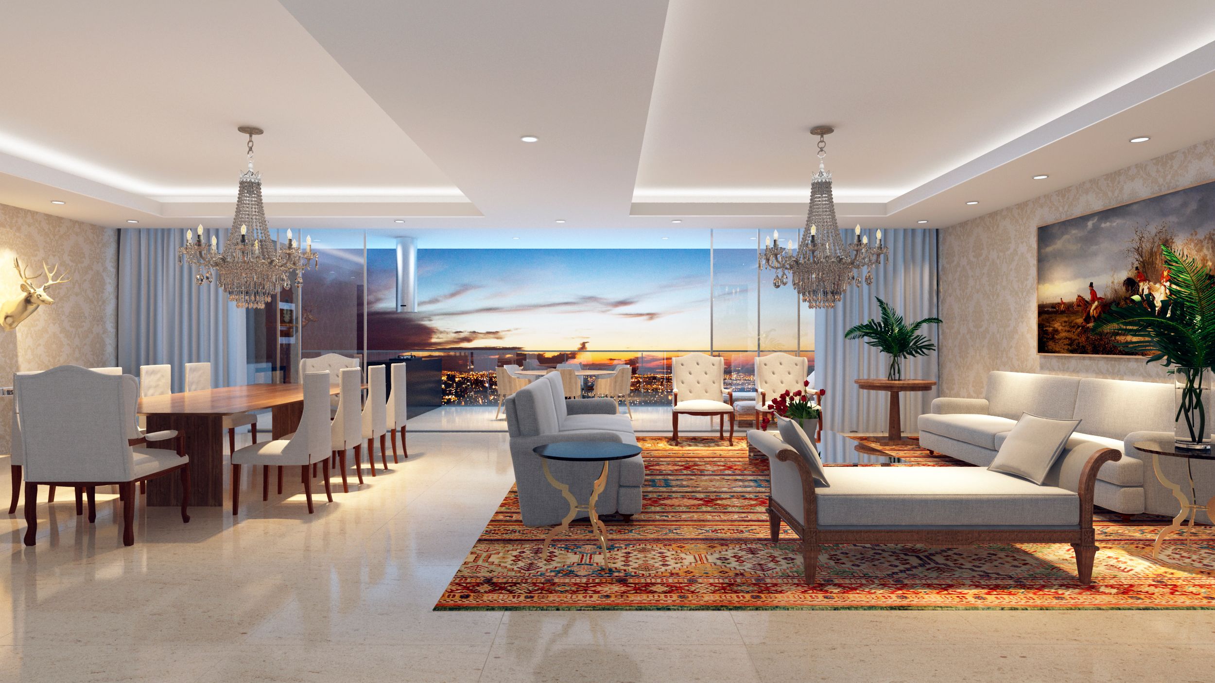 Ele não esquece que a sala é da mulher e abre o coração para um toque feminino. Há uma marquesa que repousa sobre um belíssimo tapete produzido industrialmente em algum lugar entre a China e o Oriente Médio do qual ninguém sabe direito o nome. Também mais um lustre palaciano aqui. Não é feito por um artesão do vidro, mas pelo que existe de mais moderno na área, uma máquina de injetar resina. Para quê um lustre de cristal Baccarat se o efeito da peça de resina é igualzinho?