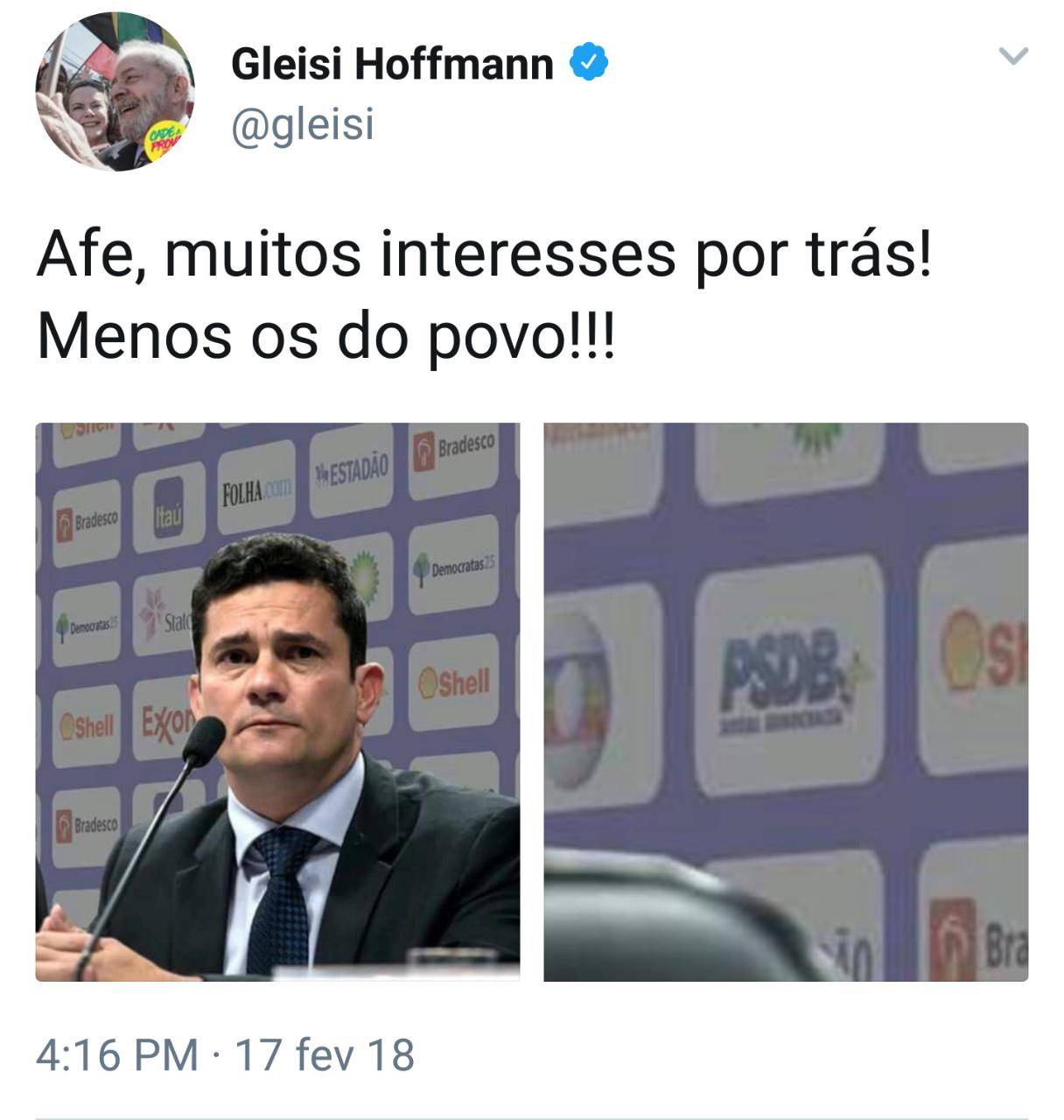 A presidente nacional do PT, senadora Gleisi Hoffmann (PR), publicou em seu perfil no Twitter neste sábado uma montagem em que o juiz Sérgio Moro aparece falando diante de um painel com diversos logotipos, entre eles os da TV Globo e o do PSDB. “Afe, muitos interesses por trás! Menos os do povo”, escreveu a parlamentar.