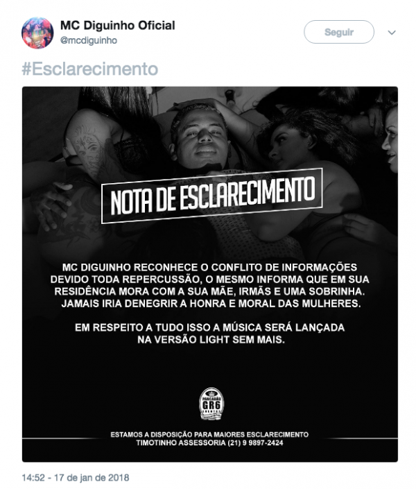 A nota fala em lançamento da “versão light”. Sim, ela foi gravada no mesmo dia, com direito a vídeo dizendo que a anterior foi mal interpretada, que ele não estava falando em fazer nada contra a vontade, que ao chamar as mulheres de malandras, filhas da p*** e outros adjetivos ele não quis ofender, enfim, mais do mesmo ritual que temos visto se repetir. Versão light, Brazyl: