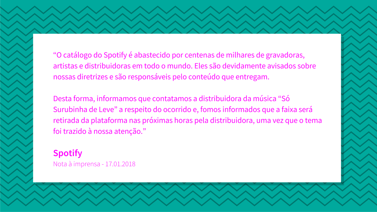 A primeira tomada de posição veio do Spotify que, apesar de ter visto “Só Surubinha de Leve” chegar ao topo das mais ouvidas do mundo, resolveu retirar a música de sua playlist.