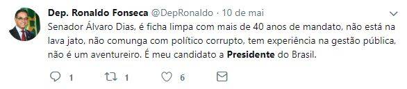 O deputado integrava a bancada do Podemos, mas foi expulso da sigla após confirmar sua ida à Secretaria-geral na última semana. Há menos de um mês, Fonseca também usou as redes sociais para demonstrar apoio ao candidato do partido ao Planalto, Alvaro Dias.