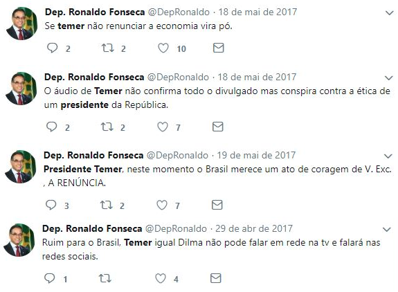“Se Temer não renunciar, a economia vira pó”, escreveu Fonseca no Twitter em maio do ano passado, após a divulgação de gravações feitas pelo empresário da J&F Joesley Batista. “Presidente Temer, neste momento, o Brasil merece um ato de coragem de V. Exc.: A RENÚNCIA”, completou, em outra postagem.
