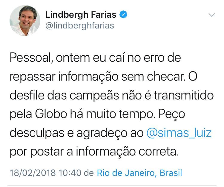 Involuntariamente gritei aleluia e já dei um print porque é raro ver isso vindo de político. Mas está aí um milagre da Quaresma: Lindbergh Farias acaba de desculpar-se por espalhar fake news sobre o carnaval do Rio de Janeiro.