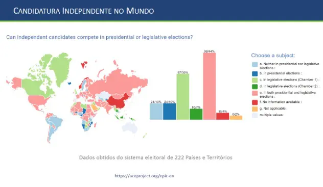 Por fim, 25 países (11%) permitem candidaturas independentes só em eleições presidenciais, entre eles Islândia, Letônia, Croácia, Sérvia, Camarões, Namíbia, etc.