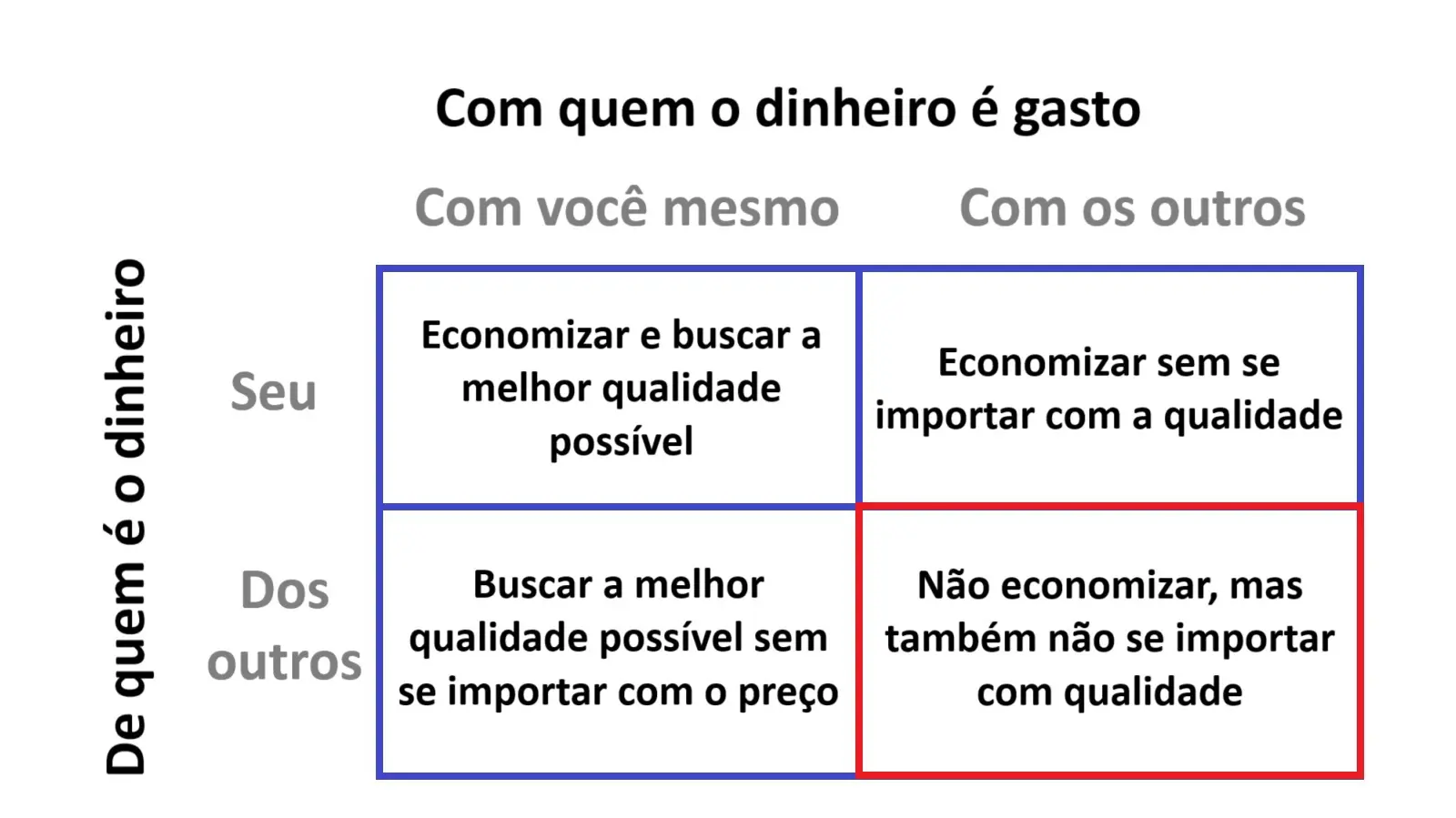 O quadrante de Friedman (Milton Friedman, Prêmio Nobel de Economia) aqui em baixo, mostra que 1. quando você gasta seu dinheiro consigo mesmo, tem incentivo a prezar pela qualidade, mas também pelo preço (baixo); 2. quando você gasta seu dinheiro com outros, o incentivo é a pensar no preço (baixo) e não na qualidade (ainda mais quando nem se conhece ou ama a pessoa, como na relação entre burocratas e cidadãos); 3. quando você gasta o dinheiro de outros com você, o incentivo é focar na qualidade e não se importar com o preço (alto); 4. quando você gasta o dinheiro dos outros com outros, o incentivo é não se importar muito nem com a qualidade, nem com o preço. E assim funciona a maioria das decisões políticas.