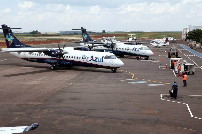 Foto do pátio do aeroporto de Cascavel com aviões da Azul e da Passaredo