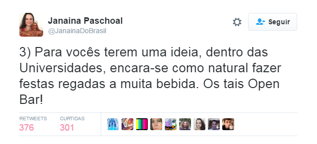 Sobre os fatos, Janaína publicou uma série de tuítes, que ganharam comentários de apoio, revolta e até de sarcasmo. Ela já foi presidente do Conselho de Entorpecentes de São Paulo. Veja os posts: