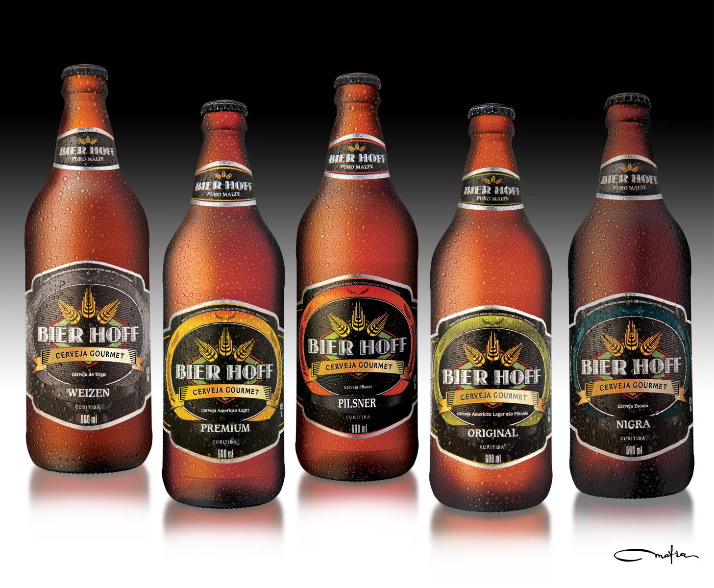 A linha Bier Hoff em garrafa. Além dessas, mais cinco estão para ser lançadas: IPA, Red Ale, Rauchbier, Stout e Porter.