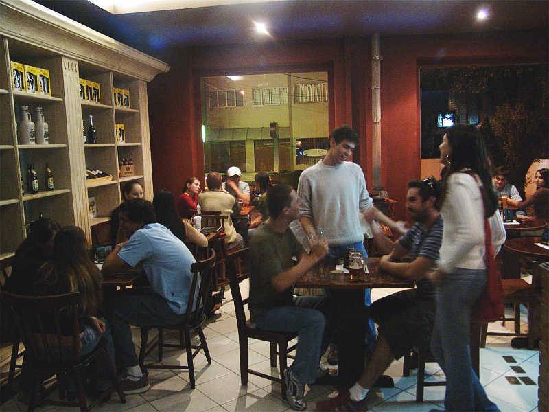 O ambiente é temático sobre cerveja e a estante, cheia de garrafas vazias das mais diversas marcas, atesta a experiência etílica de quem está atendendo no bar