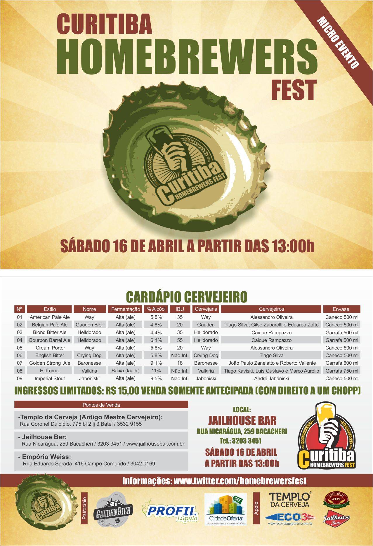 O cardápio inclui oito cervejas diferentes e um hidromel. São seis produtores. O ingresso custa R$ 15, e teve venda antecipada pelo perfil do Twitter do Homebrewers Fest. No entanto, essa modalidade já foi encerrada. Agora só é possível encontrar uns poucos convites nos pontos de venda: Templo da Cerveja (Antiga loja do Mestre-Cervjeiro.com, na Rua Coronel Dulcídio, 775 – Batel), Empório Weiss (Rua Eduardo Sprada, 416 – Campo Comprido) e o próprio Jailhouse Bar.