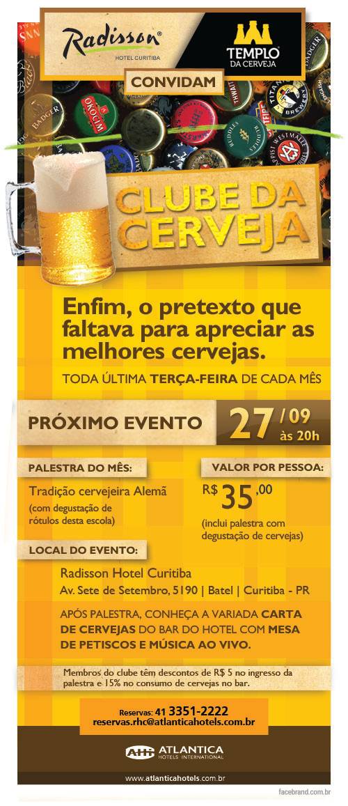 Olá, pessoal. Fiquei sabendo que neste fim de semana que vai haver uma degustação de cervejas alemãs no Radisson Hotel, em Curitiba. É mais um evento do Clube da Cerveja, que ocorre sempre nas últimas terças-feiras do mês no local. Uma ótima oportunidade para aprender sobre o assunto e sobre uma das escolas cervejeiras mais tradicionais do mundo.