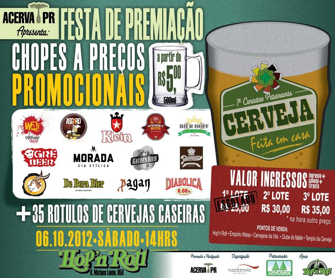 Neste sábado (6), acontece a festa de premiação do 1º Concurso Paranaense de Cerveja Feita em Casa. Organizado pela Associação dos Cervejeiros Artesanais do Paraná (ACervA-PR), o evento é aberto ao público e será realizado no bar Hop’n Roll, no Centro Cívico e deve contar com mais de 50 rótulos de cerveja com preços a partir de R$ 5, segundo a organização.
