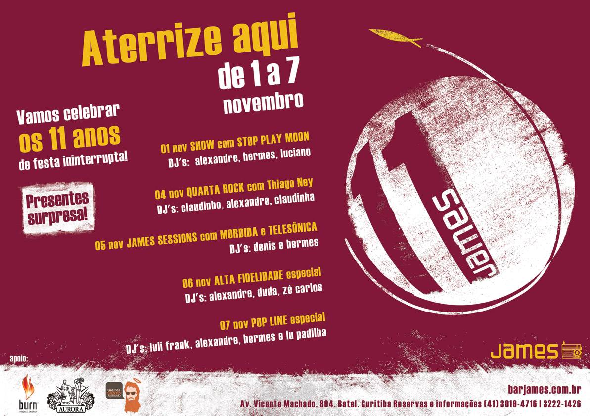O bar James, um dos mais tradicionais aqui de Curitiba, está completando 11 anos de festa nesta quarta-feira (4). E as comemorações acontecem durante toda a semana, inclusive com presentes surpresa.