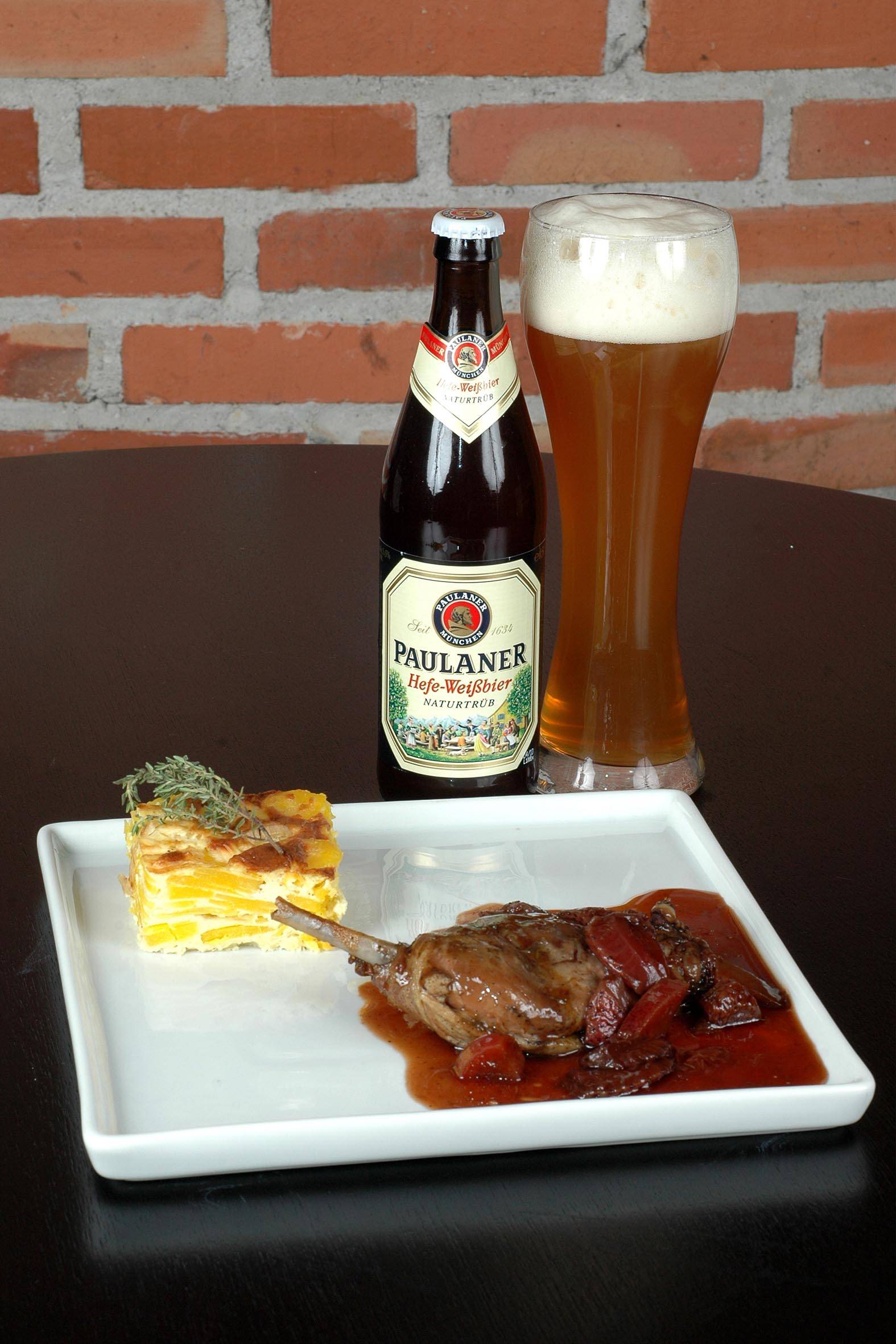 Coxa de pato ao molho de licor de cerveja aqui harmonizada com um Paulaner Hefe-Weissbier