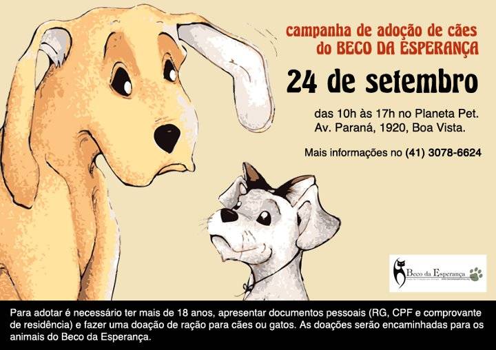 O Abrigo para cães e gatos Beco da Esperança abre as portas no próximo sábado, dia 24 de setembro, para quem quiser adotar algum dos cães cuidados pela instituição. Os interessados devem ter mais de 18 anos, apresentar documentos pessoais e fazer uma doação de ração. No total, quinze cachorros, castrados e vacinados, poderão ser adotados. Mais informações no www.becodaesperanca.org ou no (41) 3078 6624.