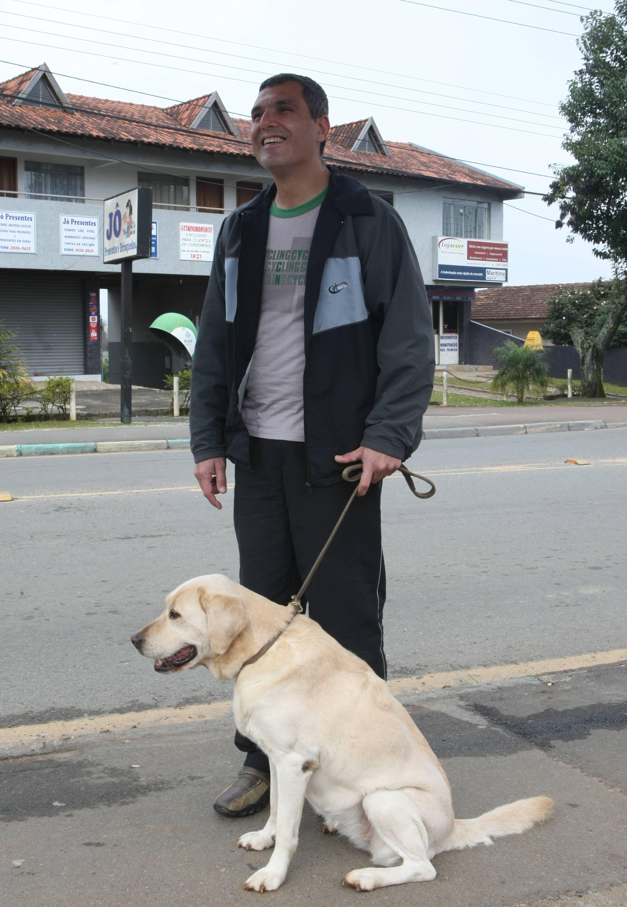 O deficiente visual Luciano Sentoni anda com seu cão-guia, a labradora Palu.
