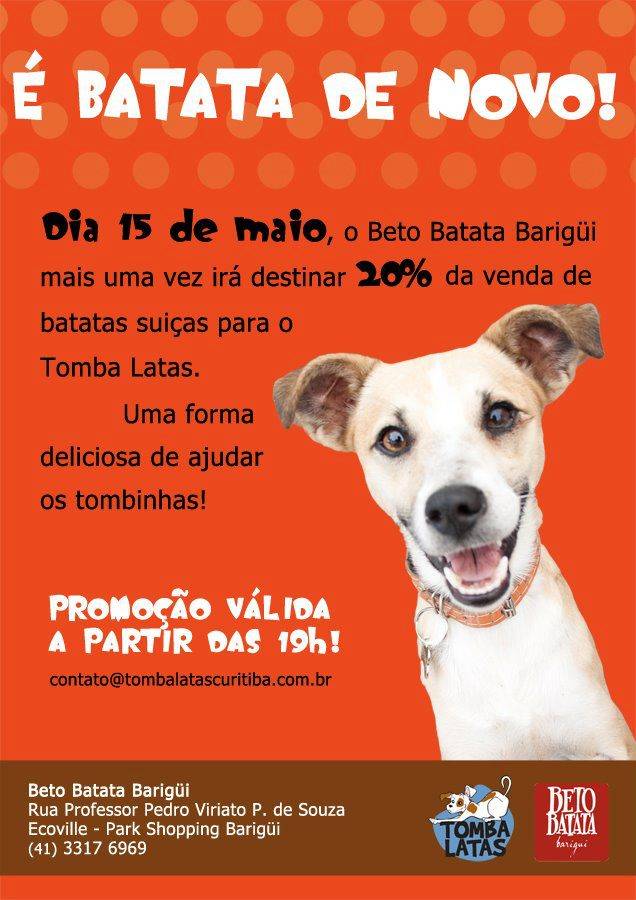 Quem gosta de animais e de batata suíça tem hoje , dia 15, uma grande chance de unir as duas coisas. O Beto Batata do Park Shopping Barigüi vai destinar 20% da venda das batatas para ajudar o grupo de protetoras independentes Tomba Latas. Vale a partir das 19h.