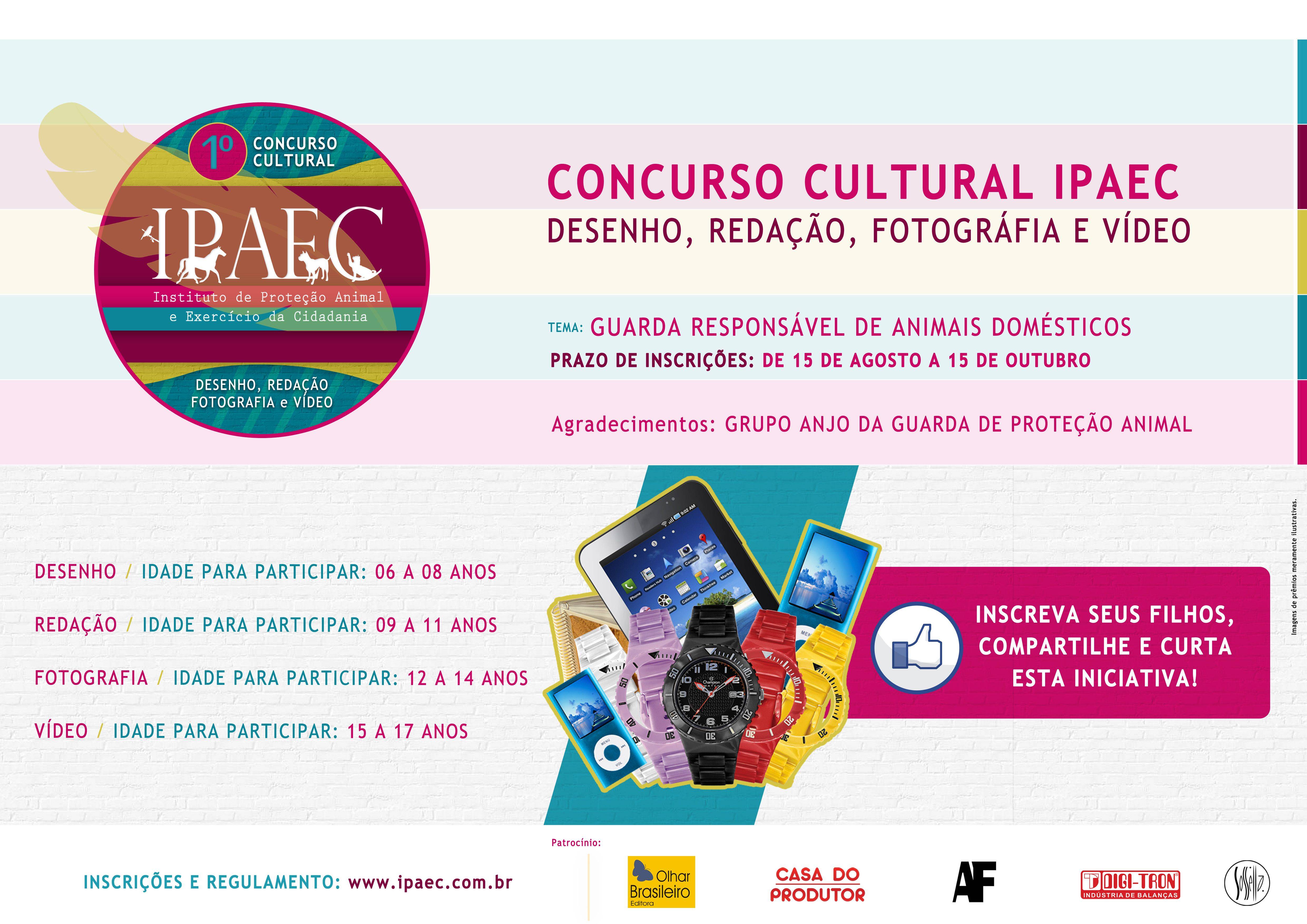 O Instituto de Proteção Animal e Exercício de Cidadania (Ipaec), com o objetivo de conscientizar crianças e adolescentes sobre a guarda responsável de animais domésticos, principalmente cães e gatos, promove o 1º Concurso Cultural de Desenho, Redação, Fotografia e Vídeo com o tema “Guarda Responsável de Animais Domésticos”.