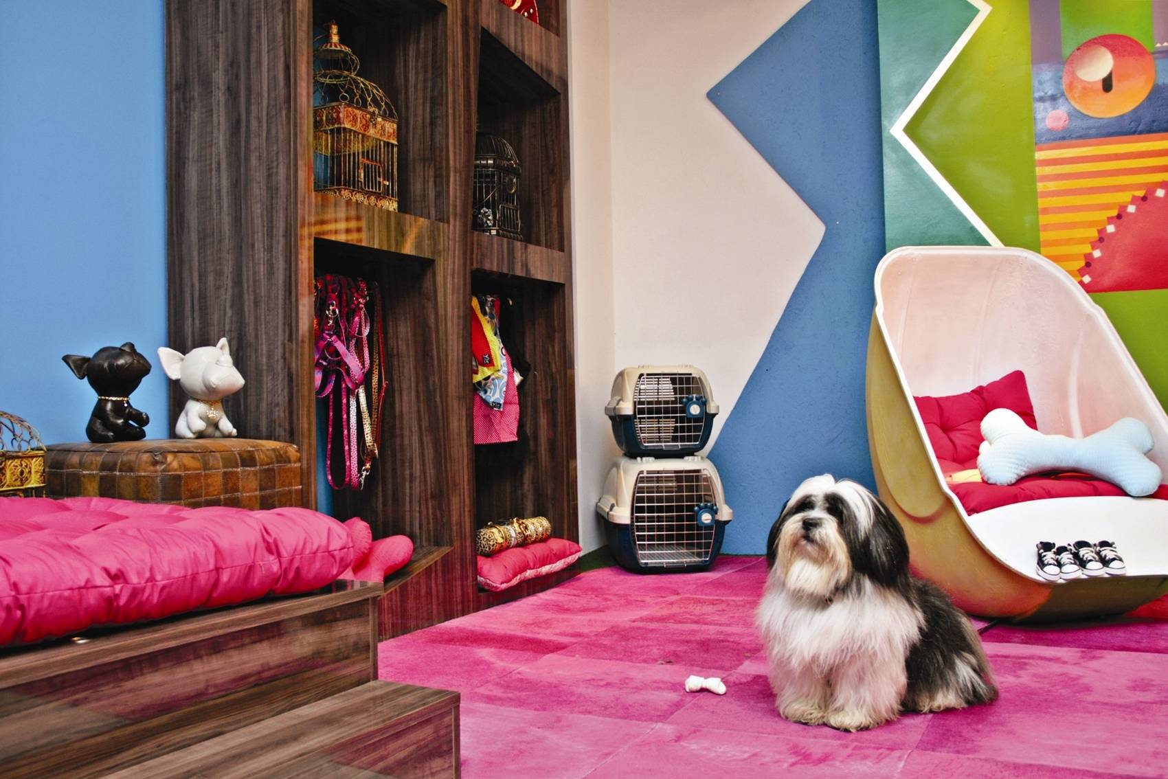 O ambiente tem minibanheira, cama feita com mala antiga e cadeira com base de cabine telefônica e um guarda-roupa canino completo exposto no ambiente e as roupas foram feitas de fibras de bambu e garrafas pet.