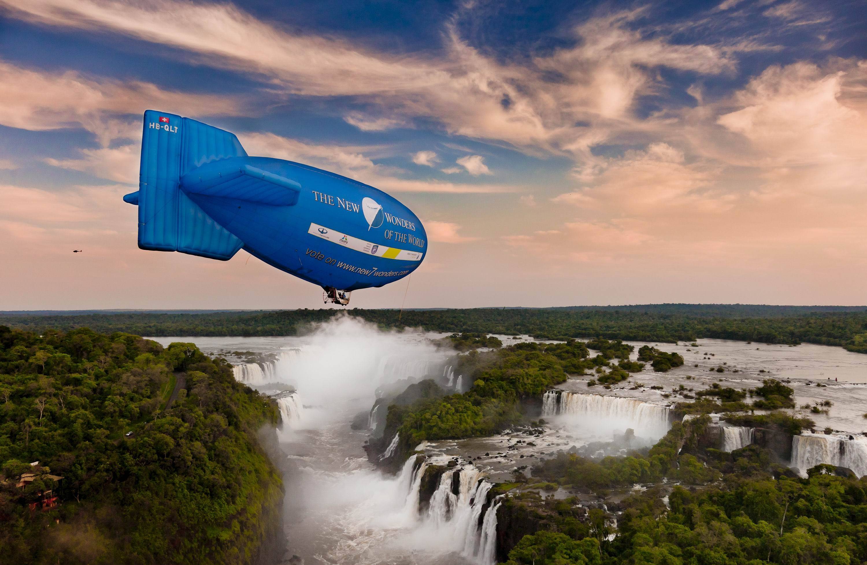 Sobrevoo do dirigível da fundação New Seven Wonders abre as comemorações pelo título na fronteira do Brasil e Argentina
