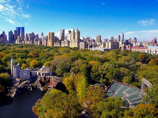O Central Park será palco de vários espetáculos gratuitos. No Delacorte Theater (à direita), Al Pacino interpreta o personagem Shylock,na peça O Mercador de Veneza.