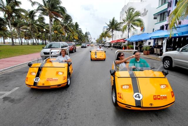 Chamativos, os carrinhos amarelos podem ser vistos circulando por South Beach, em Miami (EUA).