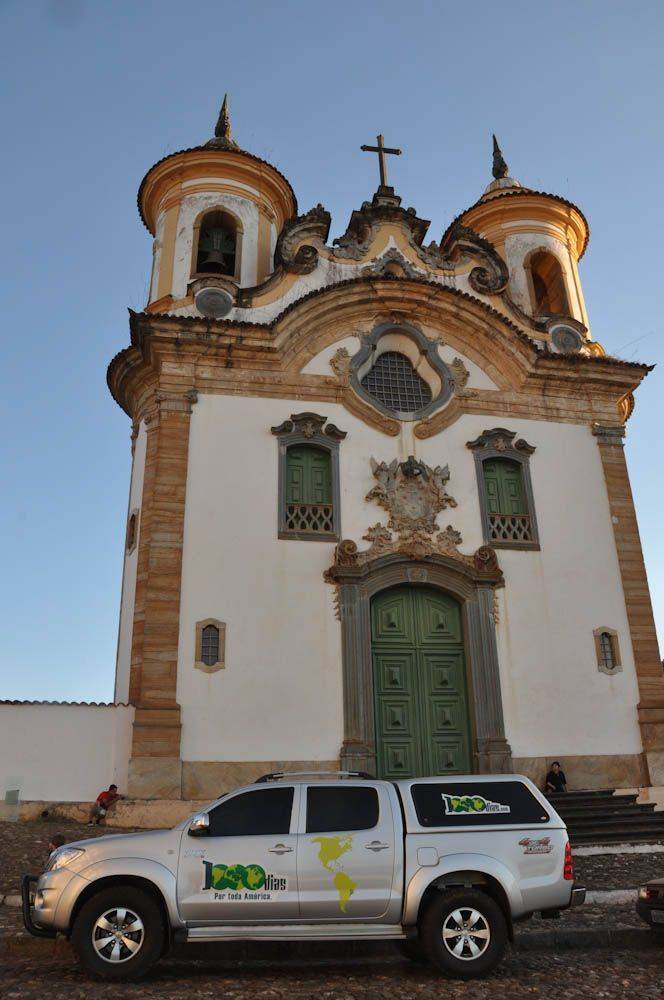 A picape Fiona em frente à igreja em Mariana, cidade histórica mineira que faz parte do roteiro da Estrada Real.