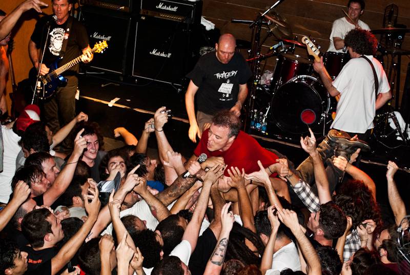 Com 53 anos, Biafra subiu no palco após o show da banda de abertura, No Milk Today, vestindo um jaleco branco, luvas de borracha vermelhas e uma camiseta cuja estampa era a bandeira dos Estados Unidos – quase um uniforme de palco, de tão recorrente. Abriu os trabalhos da noite com a música “The Terror of Tinytown”, do disco The Audacity of Hype, o público que até então estava um pouco apático acordou. A tradicional roda de pogo se abriu enquanto os primeiros loucos se arremessavam do palco. Uma menina, abraçada com o namorado, comentav: “Ele é muito lindo!”. Bom, lindo talvez não seja, mas carismático sim. Jello Biafra cantou, gritou, dançou, fez gestos e mímicas para acompanhar cada música de sua contagiante performance. “Electric Plantation”, “New Feudalism” e “Three Strikes”, todas de seu mais recente projeto, foram cantadas em coro pelo público, mas materiais ainda inéditos como “Barack Star O’Bummer”, “John Dillinger” e um spoken word sobre os criminosos de guerra do governo Bush que sustentava o bordão “torture is not ok” (tortura não é ok) não deixaram o público a ver navios.