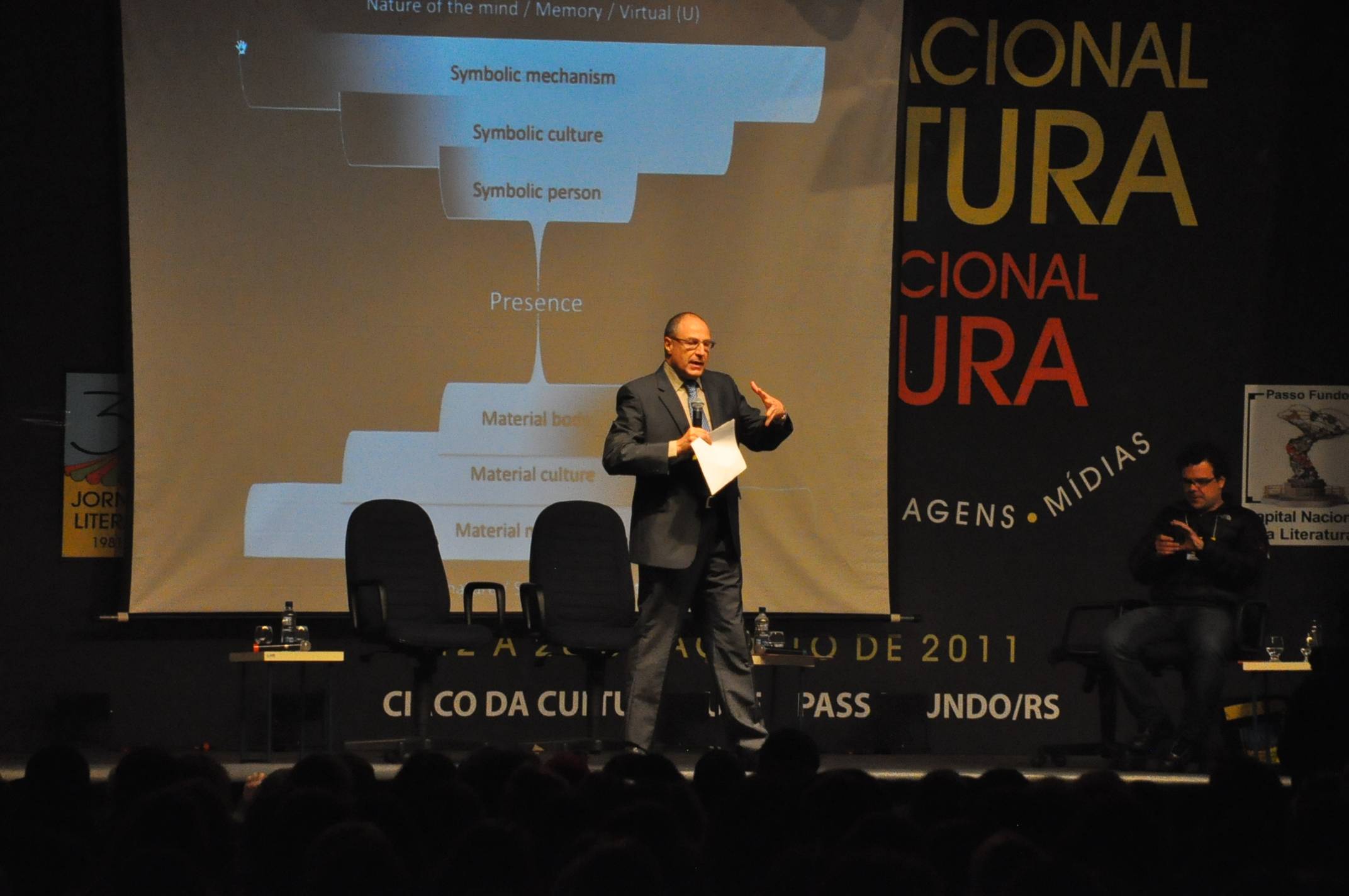 O teórico tunisiano Pierre Lévy se apresentou na noite de ontem na tenda principal da Jornada Nacional de Literatura. Saudado como um verdadeiro rockstar, o criador do conceito de inteligência coletiva subiu ao palco em meio a palmas e gritarias para sua palestra que tinha como tema “Horizontes do conhecimento na era digital”.