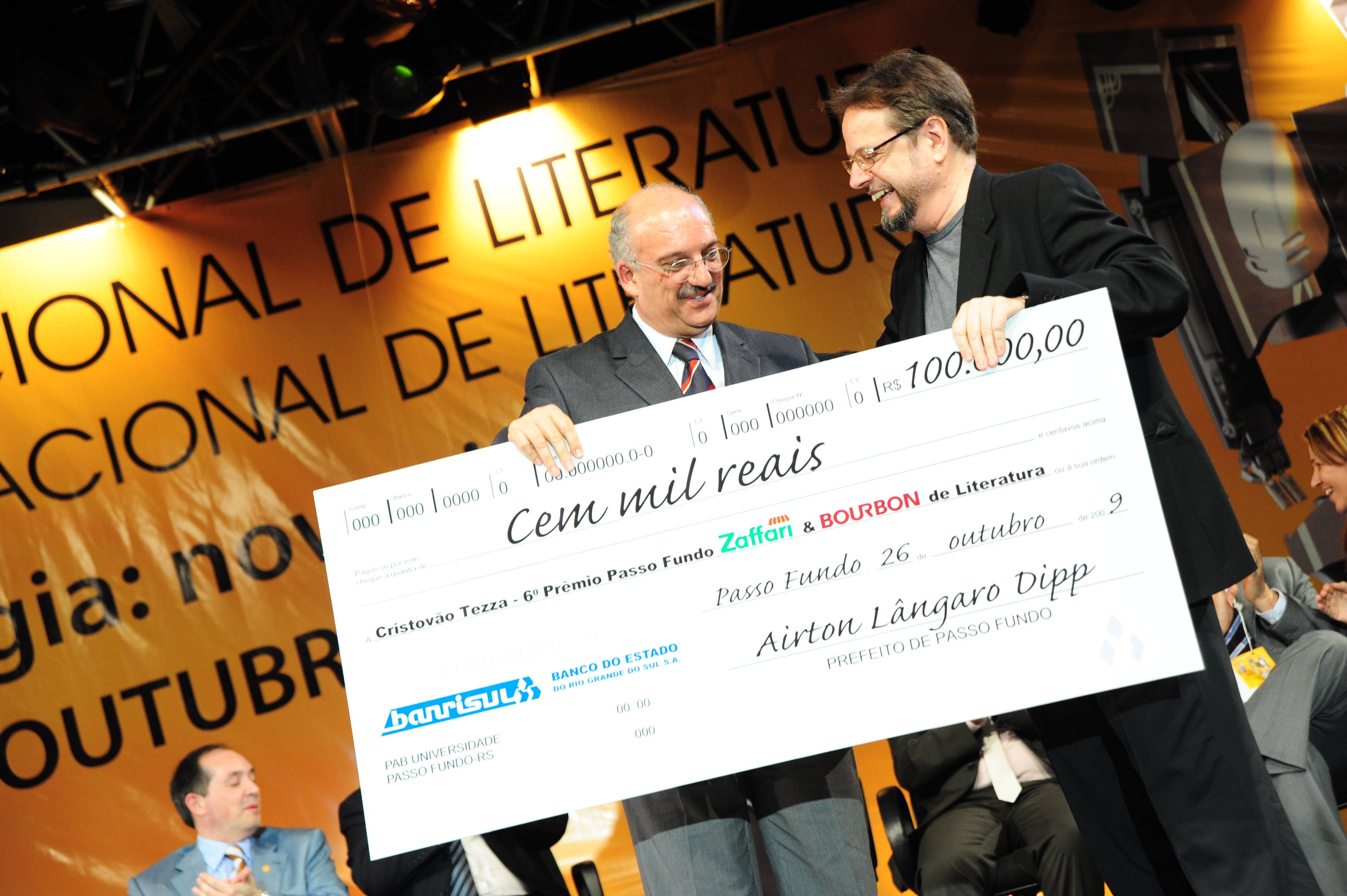 O prefeito de Passo Fundo, Airton Langaro Dipp, entregou o cheque, o real, e o simbólico, para Cristovão Tezza.
