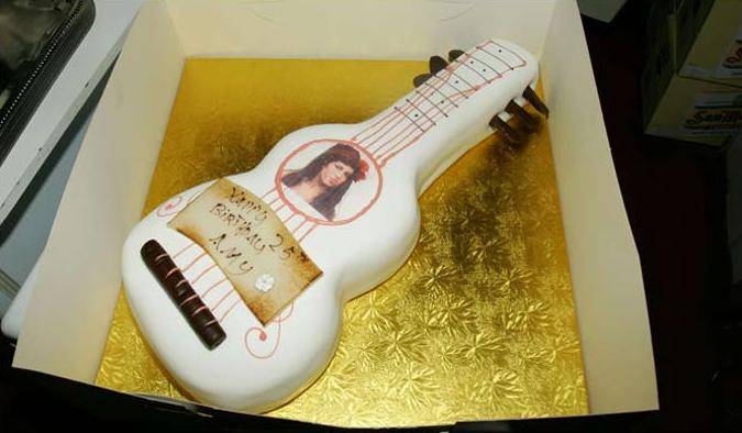 Até o dono do bar a esperava. Entre os presentes que Amy ganharia estavam: uma pintura dela com Blake (uó) e um bolo em formato de guitarra – que o dono do local iria dar para ela!