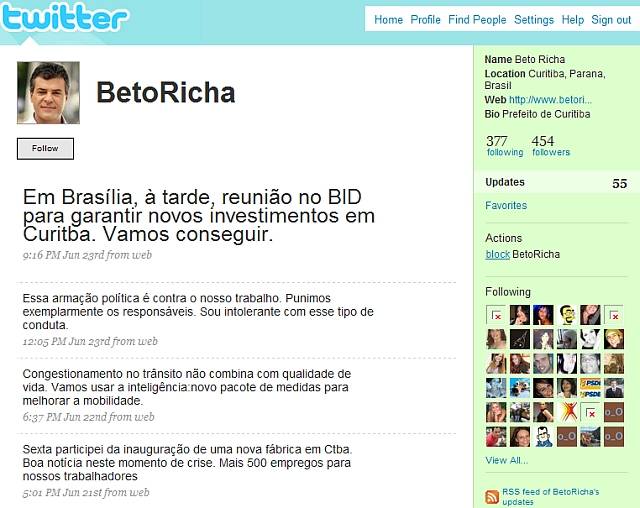 O Twitter é realmente uma rede social incrível. Tão incrível que já une teenagers wannabes, nerds, usuários comuns de internet, blogueiros, celebridades, jornalistas, estilistas, presidentes… e agora até prefeito! Não botei fé quando achei o Beto Richa no Twitter, Curitiba (falei da capital para ficar mais regional, ok?!).