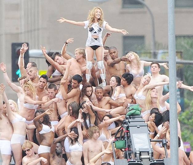Morro com a Kylie Minogue! A cantora australiana gravou cenas de seu próximo clipe All The Lovers em Los Angeles, no domingo (9). Nas imagens que os pa-pa-paparazzi flagraram, vemos Miss Minogue ahazando no topo de uma pilha de gente seminua. Acho válido.