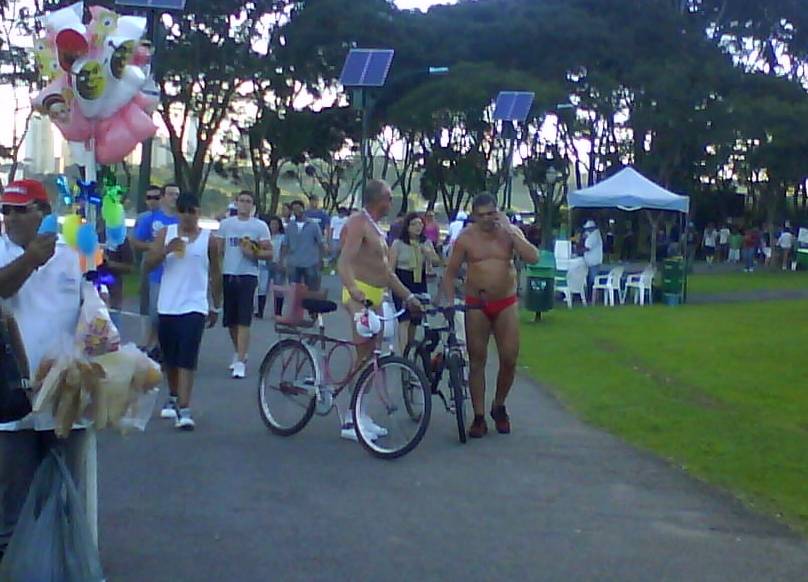 Flagra! Miacabo com nossa capital paranaense e seus “super-heróis”. O paladino das araucárias, a.k.a. Oil Man (isso mesmo, aquele cara que fica pela cidade faça chuva ou faça sol andando de bicicleta só de sunguinha e besuntado em lictros de óleo), deu as “caras” pelo Parque Barigui, em Curitiba, neste domingo (2).